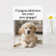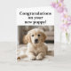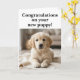 A puppy resting on a cream-colored knitted blanket. The interior features a humorous verse about the reality of pet ownership, including lost sleep and chewed shoes. A playful way to welcome a new family member. The picture and the text can be changed.