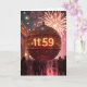 As fireworks burst in the night sky, a large metallic shiny ball shows '11:59' while a crowd gathers beneath an archway to watch the dazzling display.