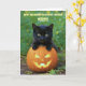 Un tout petit chaton noir avec ses pattes reposant sur un joyeux et souriant Jack O'Lantern, une façon parfaite d'envoyer des voeux d'Halloween à votre nièce !