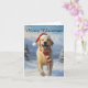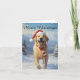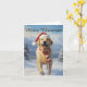 Design coloré d'un Labrador heureux portant un chapeau de santa traversant les montagnes enneigées et souhaite un joyeux noël.