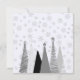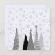 Carte de Noël blanche d'hiver monochromatique. Art Abstrait représentant des flocons de neige blancs et gris d'hiver et des silhouettes d'arbres de Noël cool. Retour personnalisé avec une typographie élégante.