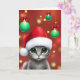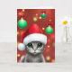 Un mignon chat gris portant un chapeau de Père Noël entouré d'ornements de Noël verts, créant une carte festive et joyeuse "Happiest of Holidays".