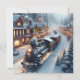 Carte de Noël personnalisée illustrant une illustration d'un train vintage qui traverse un village enneigé par jour d'hiver.