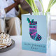 Un bas de Noël à motifs amusants en rose et turquoise avec un bouquet de saint. Le design est personnalisé avec un nom et un accueil, qui peuvent être changés tous deux. le design est assis sur un arrière - plan bleu clair à l'avant et à l'arrière et cela peut aussi être changé.