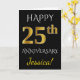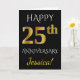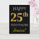 Cette carte de vœux d'anniversaire de mariage simple et personnalisée comporte le message "JOYEUX 25e ANNIVERSAIRE DE MARIAGE", le "25e" ayant une apparence dorée imitation. La couverture comporte également un nom personnalisé et un fond noir. L'intérieur comporte un message de vœux d'anniversaire de mariage personnalisé. Cela pourrait être offert à un mari ou une femme pour célébrer le vingt-cinquième anniversaire de mariage du couple. [~Z0000076]