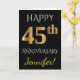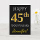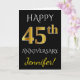Cette carte de vœux personnalisée simple pour anniversaire de mariage comporte le message "Joyeux 45ème Anniversaire de Mariage", avec le "45ème" ayant une apparence similaire à de l'or imitation. La couverture comporte également un nom personnalisé et un fond noir. L'intérieur comporte un message de vœux personnalisé pour l'anniversaire de mariage. Cela pourrait être offert à un mari ou une femme pour célébrer le quarante-cinquième anniversaire de mariage du couple. [~Z0000076]
