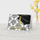 Carte de voeux élégante d'obtention du diplôme, faite dans un motif noir et blanc de damassé, avec des graphiques du casquette de la taloche d'un diplômé noir, avec un gland goldtone, dans le coin supérieur droit. Le texte graphique goldtone de manuscrit lit des félicitations, sur l'avant. La salutation noire des textes, sur l'intérieur, est prête à personnaliser pour lire ce que vous voulez. Jolie carte à votre fille de graduation préférée.