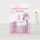 Un doux poney rose qui ressemble à votre petite-fille trottine avec le numéro un ! Des détails dorés sont tissés dans sa crinière et sa queue. Carte parfaite pour souhaiter à votre petite-fille son 1er anniversaire ! Vous pouvez personnaliser le nom sur cette carte.