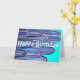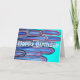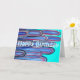 Carte d'anniversaire dans le style rétro des années 1960, parfait pour un surfeur ou un amoureux de la plage et de l'océan - un design imprimé à partir d'art original dessiné à la main et peint. Cette courbe bleue, violette et turquoise, comme motif, est un doodle d'art graphique qui s'inspire des vagues douces de l'océan léchant contre le rivage. Couleurs cool parfaites pour l'été.