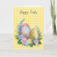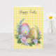 Jolie aquarelle décorée oeufs de Pâques avec un ruban rose sur un motif en vichy jaune et blanc. Tout le texte est modifiable.