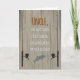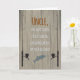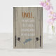 Carte d'anniversaire pour tout oncle qui aime pêcher. L'avant présente des silhouettes de canne et de bobines ainsi qu'un poisson qui saute sur un arrière - plan à grains de bois avec un effet déprimé. Des puns de pêche intelligents à l'avant et à l'intérieur sont sûrs d'apporter un sourire.