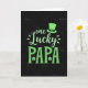 This card features the phrase “one Lucky PAPA” centered on a deep black background, with lime-green lettering that glows against the dark. “one Lucky” sits above in a flowing, cursive-style line, giving the words a gentle, affectionate feel, like a soft note meant just for him 💚. A small leprechaun hat rests above the word “one,” tipped slightly as if it’s winking at the reader, complete with a simple buckle. “PAPA” is placed beneath in large capital letters, heavier and steadier, like a strong base under the lighter line above. Little four-leaf clovers are tucked into the openings of the A’s, adding a quiet nod to luck and a sweet, family-forward touch ☘️. The high contrast between the black field and the green text keeps everything crisp and easy to read, with the message staying right in the middle of the design. In the background, a faint grid and soft clover outlines drift across the black, adding depth without pulling attention from the central text and hat.