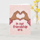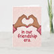 This greeting card shows two brown hands meeting in the center to form a heart shape with their fingers. The fingernails are painted a bright fuchsia pink, and the hands look gentle and steady, like a caring gesture. Each wrist has a small gold bead bracelet, and the sleeves are soft pink with visible stitching near the cuffs. The background is a light blush pink that fades a bit as it goes up, with many faint little hearts floating around behind the hands. Near the bottom, the card reads “in our friendship era” in rounded, thick crimson letters that stand out clearly. The message feels focused on friendship as well as love, making it great for a friend, partner, or someone you care about. ❤️💌🍫 Wishing you a sweet Valentine’s Day—share your feelings and let someone know they matter.