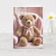 Un ours en peluche avec un ruban rose s'installe confortablement sur une chaise rembourrée rose dans une pièce doucement éclairée pour penser à vous. Le texte peut être modifié.