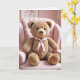 Un ours en peluche avec un ruban rose s'installe confortablement sur une chaise rembourrée rose dans une pièce doucement éclairée pour l'anniversaire. Le texte peut être modifié.