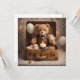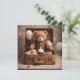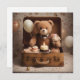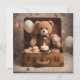 Un ours en peluche assis dans une vieille valise. Dans la valise, il y a 3 gâteaux d'anniversaire, un avec une bougie. Il y a aussi plusieurs ballons flottant dans l'air autour de la valise.