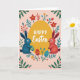 This card features a warm golden-yellow oval at the center with a celebratory message in flowing lettering, set to stand out clearly against the background. On the left, a long-eared blue bunny holds a patterned egg close, angled inward as if sharing a quiet, friendly moment with the scene. On the right, a long-eared coral-red bunny mirrors the pose, its gentle stance and inward gaze suggesting a sweet connection between the pair 🐰. Around them, leafy green shapes, small red blossoms, and tiny teal buds form a decorative border that feels like early spring 🌷. The background is a soft blush pink, keeping the focus on the central oval and the two animals. A few smaller patterned eggs sit near the lower area, some perched on thin stems, adding depth and detail without crowding the layout. The central message appears in a darker tone on the yellow oval, while the surrounding patterns use blues, reds, greens, and teals in tidy, flat shapes. Near the bottom, several geometric eggs rest among slender sprouting stems beneath the two bunnies.