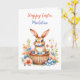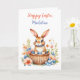 Petit lapin lapin vintage et doux assis dans un panier de Pâques et fleurs aquarelle art. Joli pêche, corail, rose et bleu jardin de fleurs. Douce citation de Pâques. Carte mignonne pour un enfant. La page intérieure est une page de coloriage. Carte de Pâques personnalisée.