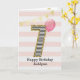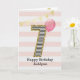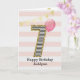 Carte d'anniversaire 7 ans pour filles, or et rose, que vous pouvez personnaliser avec son nom. La couverture de cette belle carte d'anniversaire pour elle comporte le chiffre sept dans une rayure noir et blanc avec un contour de paillettons avec un ballon rose prêt à s'envoler. Veuillez noter que les paillettons sont un effet de design et qu'il n'y aura pas de véritables paillettons sur cette carte d'anniversaire. Le fond est un blanc et rose doux avec une banderole dorée en haut. Le message à l'intérieur peut être facilement personnalisé si vous le souhaitez. Une carte d'anniversaire 7 ans unique pour petite-fille, fille, nièce, etc.