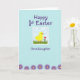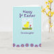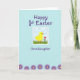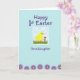 This card features a calm pale blue background with faint cloud shapes, setting a gentle springtime scene 🌷. In the middle, a roughly edged white frame surrounds a simple illustration of a round, sunny yellow baby bird standing on stylized green grass. Its tiny orange beak and feet and a single dark eye give it a sweet, trusting look, as if it’s leaning toward a companion. Right beside it, a tall red tulip rises on a green stem, positioned close enough to feel like a friendly gesture between the two. Across the top, rounded purple lettering reads “Happy 1st Easter,” and matching purple text along the bottom says “Granddaughter,” balancing the layout 🐰. The purple words sit outside the framed picture, leaving the center scene uncluttered and easy to focus on. Along the lower edge, a neat row of small purple flowers with bright yellow centers forms a decorative border.
