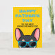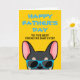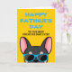 Français, quoi de mieux pour montrer à votre Papa combien vous l'aimez pour la fête des Pères avec une carte personnalisée juste de vous ! Le design présente une illustration de style cartoon d'un bouledogue français de couleur noir et fauve portant des lunettes de soleil bleues avec la mention "Joyeuse fête des Pères au meilleur Papa Français de tous les temps !" écrite sur le devant. L'intérieur de la carte indique "À Papa, je t'aime plus que les friandises" mais peut être modifié selon vos préférences.