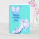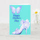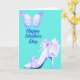 Un papillon en haut et une chaussure en bas de l'image avec le message “Joyeuse fête des mères” au milieu, le tout en bleu sur fond sarcelle par martinspixs.