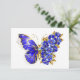 Bijoux, bleu, saphir, papillon fleur scintillant avec aile décorée de fleurs bleues précieuses avec feuilles dorées sur fond blanc.