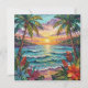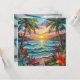 Jolie carte vierge avec une superbe illustration de style peinture à l'huile impasto réalisée par ia de l'océan bleu, d'une plage de sable entourée de palmiers au coucher du soleil.