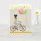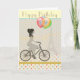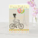 Carte de voeux chic et moderne à personnaliser avec votre propre texte pour Anniversaire ou toute occasion. Elégante fille à vélo avec la serviette Eiffel dans l'arrière - plan et ballons attachés aux guidons. Image bordée par un motif à points polka multicolores.