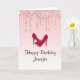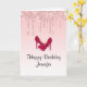 Une carte d'anniversaire moderne et branchée. L'arrière - plan a une image d'une fausse parties scintillant scintillante le long du sommet. Le reste de l'arrière - plan est un délicat dégradé de couleur rose pastel. Une paire de talons roses hauts sous la parties scintillant goutte.