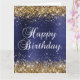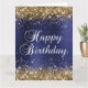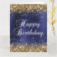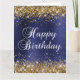 Parties scintillant en or brillant au format vertical et en satin bleu foncé et bleu marine et sombre en art numérique graphique. La couleur blanche du graphique texte Happy Birthday peut être modifiée, ou vous pouvez utiliser un script de calligraphie moderne du système. Conservez ou supprimez le message texte et la signature de l'intérieur. La couleur noire et le style de calligraphie de classe peuvent également être changés.