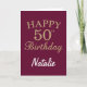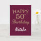 Burgundy Red and Gold Parties scintillant 50th Birthday Card avec nom personnalisé. Pour plus de personnalisation, cliquez sur le bouton "Customiser" et utilisez notre outil de conception pour modifier ce modèle.