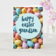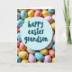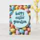 This card features a soft pastel scene that feels like a gentle Easter celebration shared between close family members. In the middle sits a light blue circular badge, like a small sign set into the design, drawing the eye right away. The words “happy easter grandson” are centered on the badge in darker blue lettering, arranged neatly to feel close and affectionate. Around the circle, dozens of small oval egg shapes crowd in like a cozy nest, suggesting a sweet little find from a springtime hunt 🐰. The eggs mix pale blue, pink, buttery yellow, creamy ivory, and peach tones, and their smooth, slightly matte finish gives them a candy-like look. The tight, close-up view makes the eggs feel gathered together, as if they’re leaning in around the message like a warm group hug 🌷. Soft, diffused light falls across the cluster, with the central blue circle staying crisp while the surrounding eggs blur slightly at the edges.