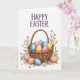 This design shows a rustic woven basket in natural brown, filled with softly glowing egg shapes in gentle blues, sunny yellows, tender pinks, and warm oranges. Around the basket, leafy green sprigs and small blossoms in pink, yellow, and lavender curl inward as if leaning close together, like friends sharing a quiet moment 🌷. The arrangement feels affectionate through its close spacing and the way the flowers seem to “gather” around the basket rather than sit apart. “HAPPY EASTER” appears above the illustration, centered near the top in plum-colored lettering that stands out against the white space. The white background keeps the focus on the basket and the pastel colors, giving everything a light, airy look. Subtle shading and watercolor-like edges soften the eggs and petals, adding a gentle, romantic touch without overpowering the scene 🐰. The basket sits near the lower center, framed by foliage on both sides, with a few blossoms pointing upward toward the plum text.