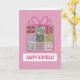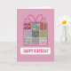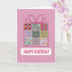 Il s'agit d'une carte d'anniversaire avec un cadeau d'anniversaire créé avec un appliqué en bloc neuf patchwork utilisant un point zig zag. L'arrière - plan est pois et le texte dit : "Joyeux anniversaire".