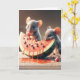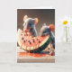 Deux mignonnes souris grignotent sur une tranche juteuse de pastèque avec du jus de fruits qui s'écoule sur la surface en bois sous elles. Le texte peut être modifié.