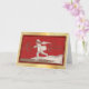 L'avant de cette carte de voeux de vacances présente une image vintage d'un livreur vêtu de blanc. Il patine avec son paquet pour livrer sous son bras. L'image est placée sur un arrière - plan de gradient d'or léger et infusé, et est bordée de rouge foncé avec une fine ligne d'or. Le dessus intérieur de la carte est assorti au rouge Vacances solide. Le bas est blanc, avec des champs de texte personnalisés pour votre propre message et signature. Célébrez Noël à l'ancienne avec cette belle carte qui présente une image d'autrefois.