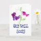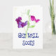 Une jolie carte "Get Well" avec pois doux rose et violet d'une aquarelle de Judy Adamson. Le lettrage est en bleu foncé et l'intérieur est laissé vide pour votre propre message. Voir aussi les cadeaux et les vêtements correspondants.