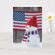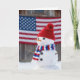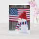 A happy snowman, wearing a vibrant red beanie and a stylish striped scarf in patriotic shades of red, white, and blue, proudly positioned in front of a rustic wooden barn that showcases an American flag.