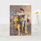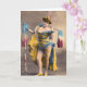 Photographie vintage amusante d'une femme en justaucorps rayé bleu et jaune sauvage, ruban jaune enroulé autour d'une jambe et accessoires rouges blancs et bleus