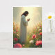 This card shows a solitary figure with flowing dark hair and a beard standing in a wide meadow, wrapped in warm golden light that softens the whole scene 🌷. He wears a simple, light-colored robe that falls to the ground, and his head tilts down as his hands press together, as if sharing a quiet, tender promise with someone just beyond the frame. Placed slightly left of center, he’s surrounded by a thick spread of wildflowers that stretches across the foreground and mid-ground. The flowers form a textured carpet of pinks, reds, whites, and oranges, with gentle blur that makes the field feel calm and distant 🐇. Across the upper area, a short greeting appears in small, light lettering, set near the top against the bright sky. The sky itself is pale and glowing, with soft rays breaking through and outlining the figure’s hair and shoulders. In the lower portion, the meadow is densely dotted with blossoms, and warm light spills between the petals.