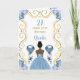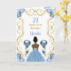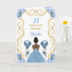 Cette invitation à la carte d'anniversaire comporte un cadre doré élégant, une belle princesse à la peau foncée et une robe bleue poussiéreuse, des fleurs et un ballon.