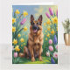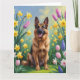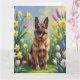 Un chien joyeux est assis paisiblement sur une herbe verte luxuriante, entouré de floraisons printanières colorées sous un ciel bleu doux. Cette peinture numérique à l'huile capture un moment serein avec des coups de pinceau expressifs, des couleurs chaudes et un sentiment de joie douce.