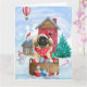 Carte Pékingese dans une maison de chien de Noël enneigé