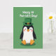 This greeting card shows a round cartoon penguin centered on a smooth, solid green background, dressed up for St. Patrick’s Day with a deep emerald top hat. The hat has a dark band and a small golden buckle, with a little shamrock tucked into the brim for a sweet ☘️ touch. The penguin’s black-and-white body is softened by rosy pink cheeks, and its bright orange beak and webbed feet add a warm contrast that makes it feel friendly and approachable 💚. Its gentle, slightly bashful expression and relaxed stance suggest the kind of easy closeness you’d share with a good friend or someone you adore. Near the top of the design, the text “Happy St Patrick’s Day!” sits above the penguin in rounded white lettering that stands out clearly against the green. A faint shadow beneath the penguin anchors it to the ground and adds a bit of depth. The overall scene stays simple and focused, with the penguin’s hat, shamrock, and bright accents drawing the eye against the even green field.