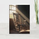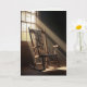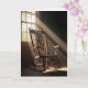 Une chaise à bascule en bois drapée d'une couverture à carreaux est illuminée par une douce lumière du soleil qui entre par une fenêtre, jetant des ombres douces sur le sol.