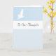 White Bird in Flight on Pale Blue Cette carte sous-titrée est intitulée "In Our Thoughts" (ou personnaliser à "In Our Prayers", s'il vous plaît). En bleu pâle avec le message d'espoir d'une colombe blanche en vol, c'est une manière douce d'express ce que les mots ne peuvent pas. Le message interne est également entièrement personnalisable.