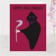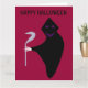 Cette carte d'Halloween effrayante présente une image de la Grande Faucheuse créée à l'aide de vecteurs. Il tient menaçamment son escroquerie dans sa main blanche osseuse. Ses yeux violets enfoncés et son sourire démoniaque ne sont visibles que sous son manteau noir.Il y a un accueil personnalisable sur le devant de la carte. L'intérieur de la carte est vide.