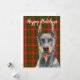 Carte de vacances avec illustration à l'aquarelle de Doberman Pinscher sur fond écossais festif vert et rouge et vœux de vacances personnalisables.