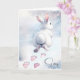 Un lapin blanc duveteux bondit à travers un paysage hivernal enneigé, laissant derrière lui des empreintes de pattes roses en forme de cœur.